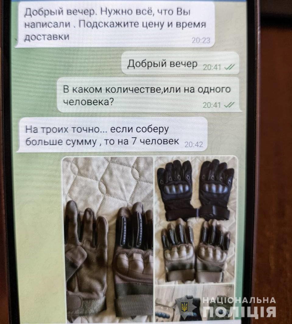 Στην πρώτη περίπτωση, στην πόλη Kryvyi Rih, οι αστυνομικοί συνέλαβαν έναν άνδρα που έβαλε αγγελία στο Telegram μέσω της οποίας υποτίθεται ότι πουλούσε φάρμακα, αλεξίσφαιρα γιλέκα και πυρομαχικά. Στην αγγελία ανέγραφε ότι η προπληρωμή ήταν απαραίτητη.