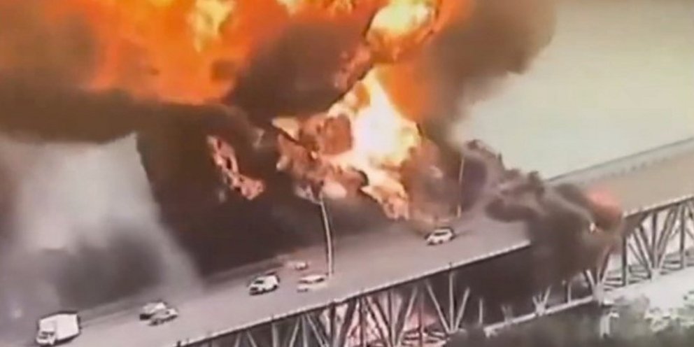 Διερχόμενοι οδηγοί και πολίτες κατέγραψαν το σκηνικό κόλασης, με την στιγμή της έκρηξης και τις τεράστιες φλόγες να «καταπίνουν» τη γέφυρα.