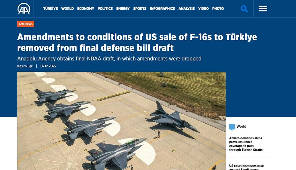 Το τουρκικό πρακτορείο ειδήσεων Anadolu μετέδωσε ότι οι όροι που έθετε η τροπολογία για την πώληση των F-16 στην Άγκυρα και την εξαρτούσαν από μια σειρά προϋποθέσεις αφαιρέθηκαν από το τελικό νομοσχέδιο για τις αμυντικές δαπάνες.
