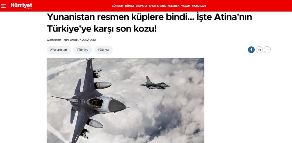 Στο ίδιο μήκος κύματος κινείται και η τουρκική Hurriyet: «Η Τουρκία βρίσκεται και πάλι στην ατζέντα της γειτονικής Ελλάδας. Ενώ η ένταση στο Αιγαίο συνεχίζει να αυξάνεται με τις δηλώσεις που προέρχονται από την Αθήνα, τα νέα από τις ΗΠΑ έχουν δημιουργήσει κατάσταση ψυχρολουσίας στην Αθήνα».