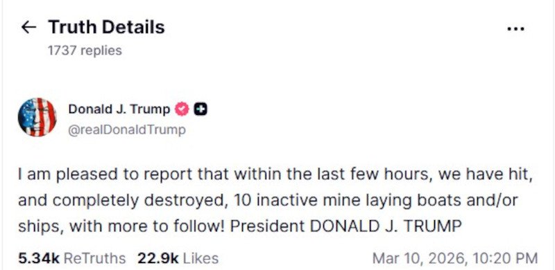 Λίγο νωρίτερα, ο πρόεδρος των ΗΠΑ, Ντόναλντ Τραμπ, είχε σημειώσει σε ανάρτησή του στην πλατφόρμα Truth Social: «Είμαι στην ευχάριστη θέση να αναφέρω ότι μέσα στις τελευταίες ώρες πλήξαμε και καταστρέψαμε ολοσχερώς 10 ανενεργά σκάφη ή πλοία πόντισης ναρκών, και θα ακολουθήσουν κι άλλα!».