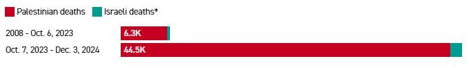 Η σύγκριση με τους αντίστοιχους αριθμούς της περιόδου 2008-2023, όταν στις κατά καιρούς εκατέρωθεν επιθέσεις είχαν σκοτωθεί συνολικά περίπου 6.600 άνθρωποι, είναι ενδεικτική της βαρβαρότητας που επικράτησε τον τελευταίο χρόνο.