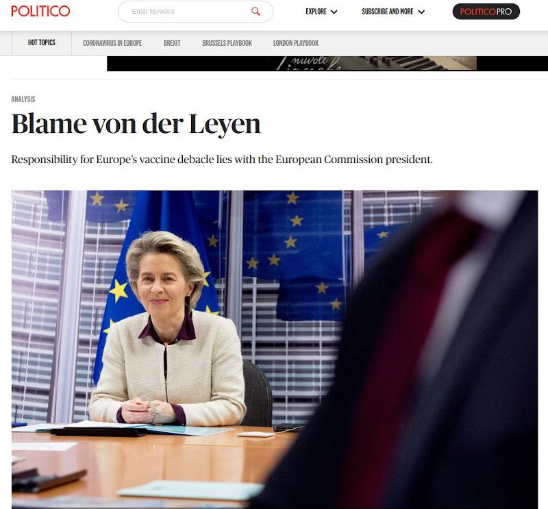 «Οι υπερασπιστές της προέδρου της Κομισιόν μπορούν να ξεσκονίζουν τα συμβόλαια της ΕΕ με τους φαρμακευτικούς κολοσσούς, να υπερασπίζονται την περίπλοκη διαδικασία έγκρισης των εμβολίων από τον Ευρωπαϊκό Οργανισμό Φαρμάκων και να παραπονιούνται όσο θέλουν για τις ελλείψεις στην παραγωγική αλυσίδα εμβολίων, αλλά τίποτα απ’ αυτά δεν αλλάζει το γεγονός ότι στις κρίσιμες στιγμές της υγειονομικής κρίσης, η Φον ντερ Λάιεν έλαβε αποφάσεις, που προκάλεσαν προσκόμματα στη διάθεση των εμβολίων και δίχασαν την Ε.Ε. Το σημαντικότερο σφάλμα της το έκανε το καλοκαίρι στη διάρκεια των διαπραγματεύσεων με τις φαρμακευτικές εταιρείες. Σε αντίθεση με τις ΗΠΑ, οι οποίες εμφανίστηκαν μ’ ένα καρνέ επιταγών 10 δισ. δολαρίων, η Φον ντερ Λάιεν παζάρευε για πενταροδεκάρες με τις εταιρείες (…) Η Φον ντερ Λάιεν αντιμετώπισε τις συνομιλίες με τις εταιρείες σαν εμπορική συμφωνία και εκτός από τις χαμηλές τιμές η Ευρώπη επέμεινα να είναι υπόλογες νομικά οι φαρμακευτικές για κάθε πρόβλημα».