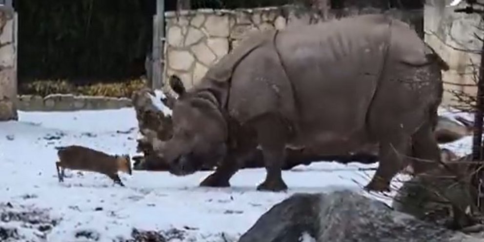 Ο ρινόκερος προσπάθησε να ξεπεράσει αυτό το… δύσκολο εμπόδιο πηγαίνοντας αριστερά και δεξιά, καθώς δεν ήθελε να του κάνει κακό. Προσπάθησε να το τρομάξει και να φύγει κάνοντας κίνηση προς το μέρος του, αλλά το ατρόμητο ελαφάκι επέμεινε και στο τέλος νίκησε, καθώς ο ρινόκερος απομακρύνθηκε.