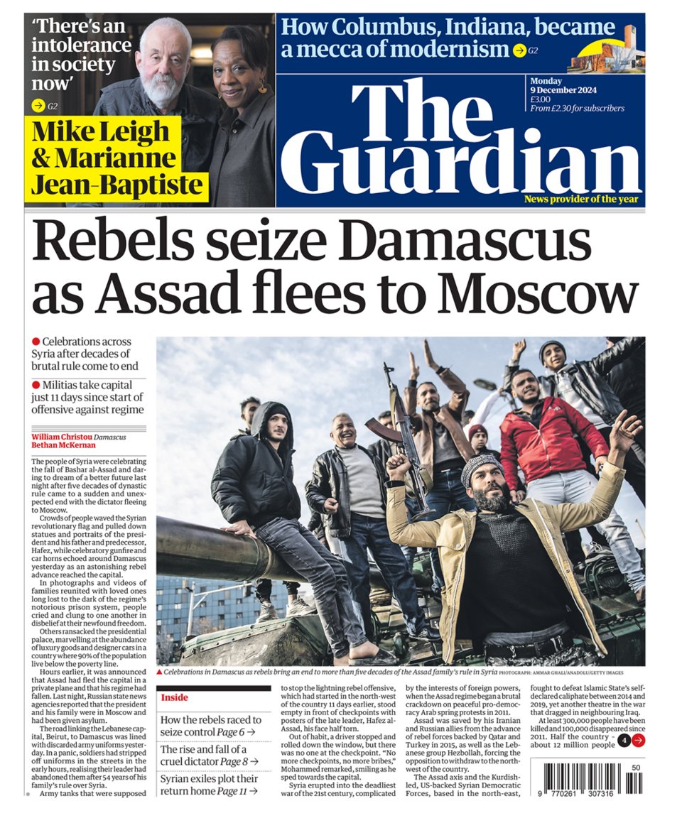 «Αντάρτες κατέλαβαν τη Δαμασκό, ο Άσαντ διέφυγε στη Συρία», γράφει στο πρωτοσέλιδό της η βρετανική εφημερίδα The Guardian.