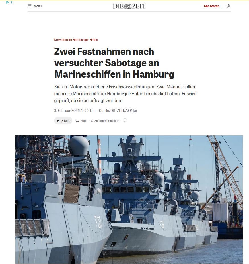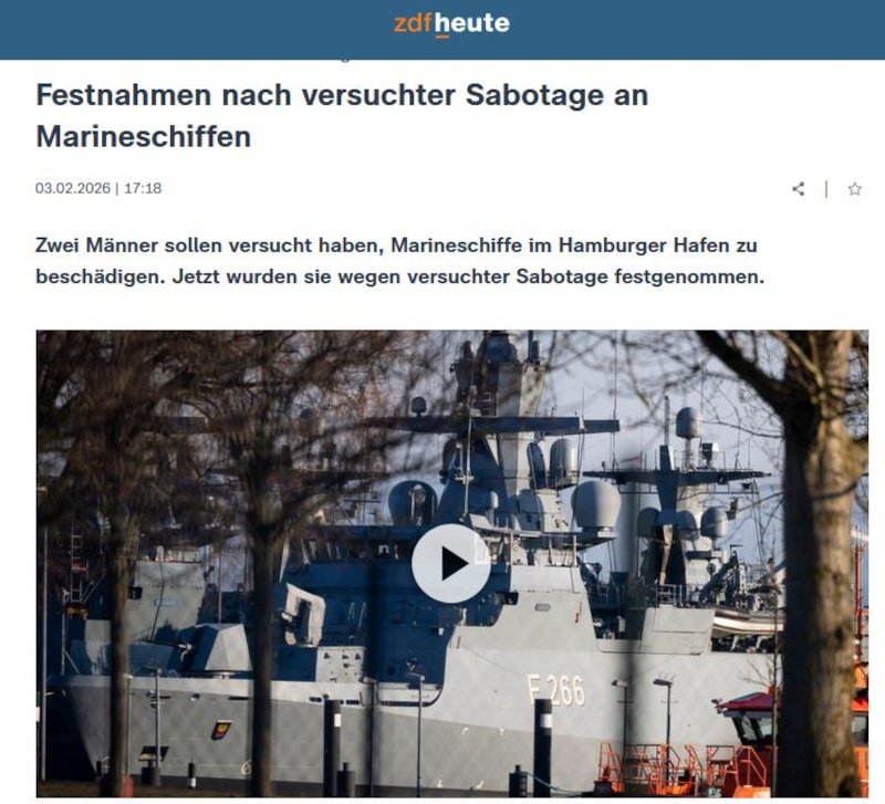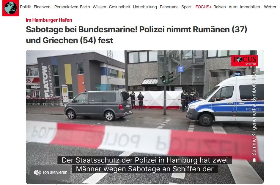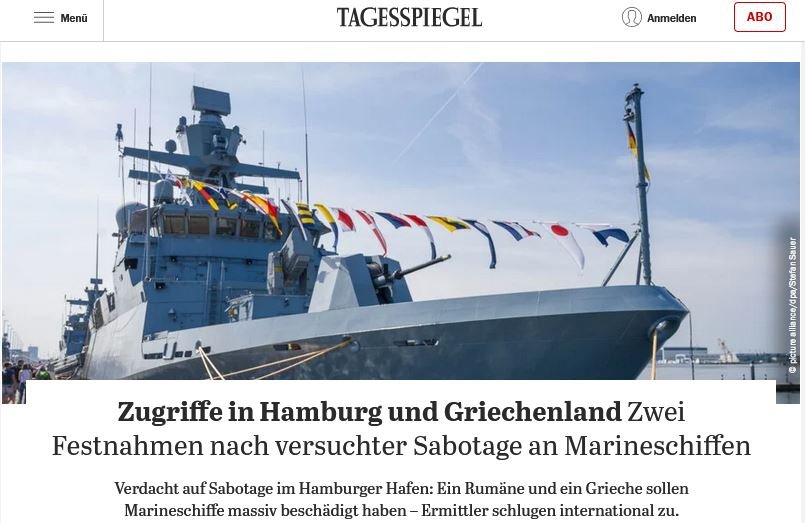 Ιδιαίτερη βαρύτητα δίνουν τα γερμανικά ΜΜΕ στη σύλληψη ενός 54χρονου Έλληνα και ενός 37χρονου Ρουμάνου οι οποίοι κατηγορούνται για απόπειρα σαμποτάζ σε πλοία του γερμανικού Πολεμικού Ναυτικού στο λιμάνι του Αμβούργου το 2025.