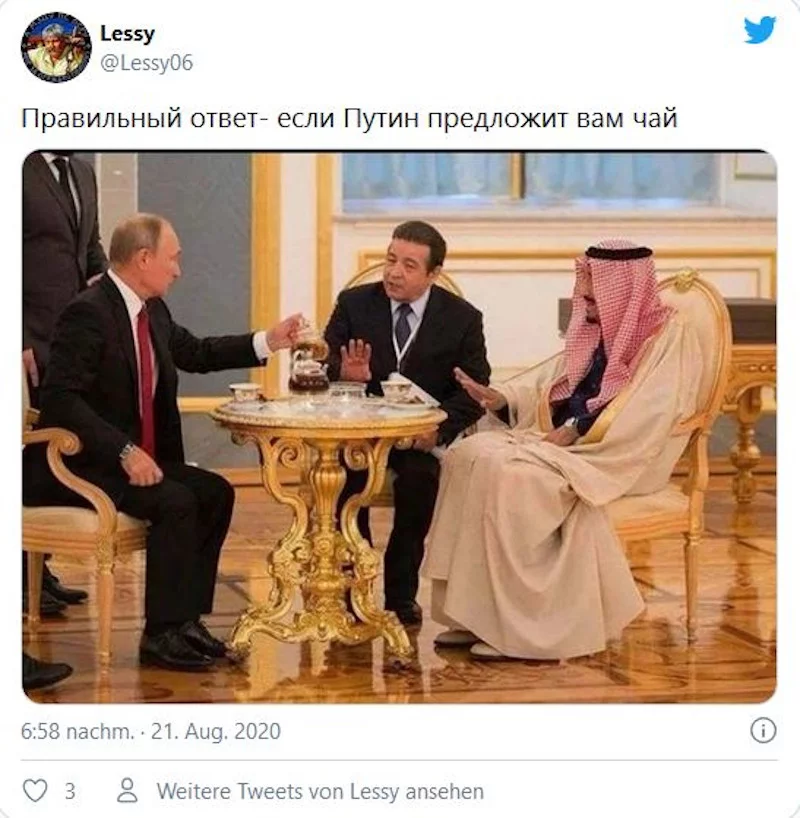 Την ώρα που οι γιατροί στη Γερμανία προσπαθούν να εντοπίσουν με ποια ακριβώς ουσία δηλητηριάστηκε ο σφοδρός επικριτής του Πούτιν και συνεργάτες του Αλεξέι Ναβάλνι «δείχνουν» το Κρεμλίνο, πολλοί στη Ρωσία διατηρούν ελάχιστες αμφιβολίες για τον υπαίτιο. Το γύρο των social media κάνει μια φωτογραφία από το 2017, όταν ο βασιλιάς της Σαουδικής Αραβίας, Σαλμάν, επισκέφθηκε τη ρωσική πρωτεύουσα. Ο Πούτιν κάθισε στο τραπέζι των διαπραγματεύσεων και πρόσφερε ένα φλυτζάνι τσάι στον φιλοξενούμενο, αλλά ο βασιλιάς – όπως και ο μεταφραστής του – αρνήθηκαν με μια χαρακτηριστική χειρονομία.