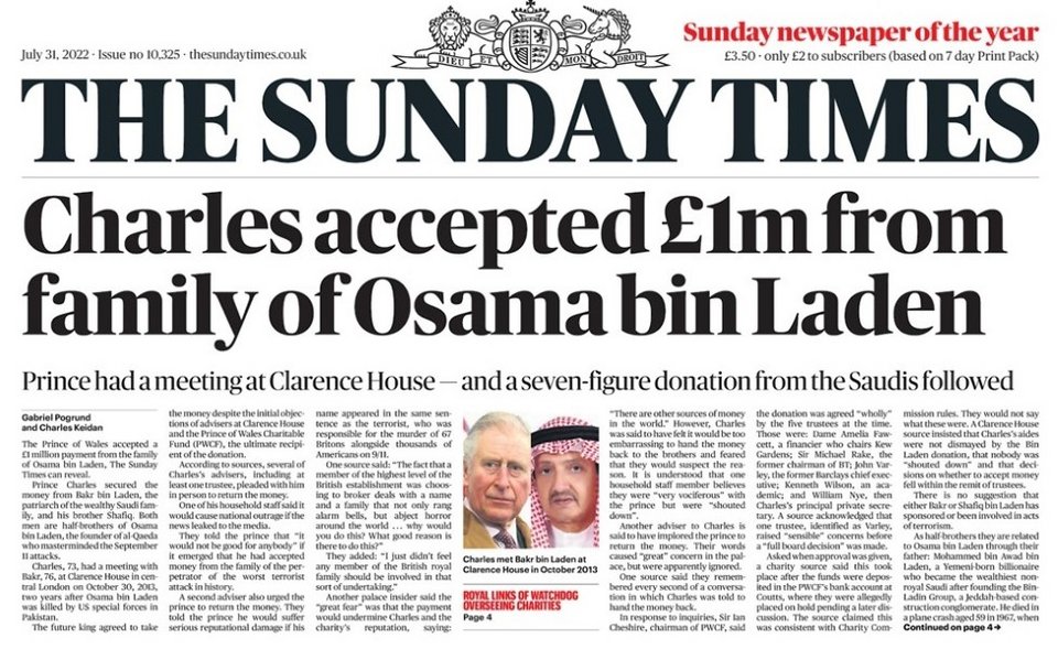 Αίσθηση προκαλεί το δημοσίευμα των Sunday Times, σύμφωνα με το οποίο ο πρίγκιπας Κάρολος της Ουαλίας δέχθηκε δωρεά ύψους 1 εκατ. λιρών από την οικογένεια του Οσάμα Μπιν Λάντεν.