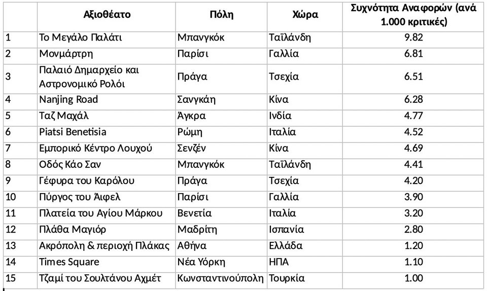 Η Ασία κυριαρχεί στη λίστα με 6 πόλεις στο Top10. Το Παρίσι (2ο) και η Ρώμη (7η) καταγράφουν σημαντικά περισσότερα περιστατικά από πόλεις όπως η Αθήνα (15η) και η Βενετία (12η).