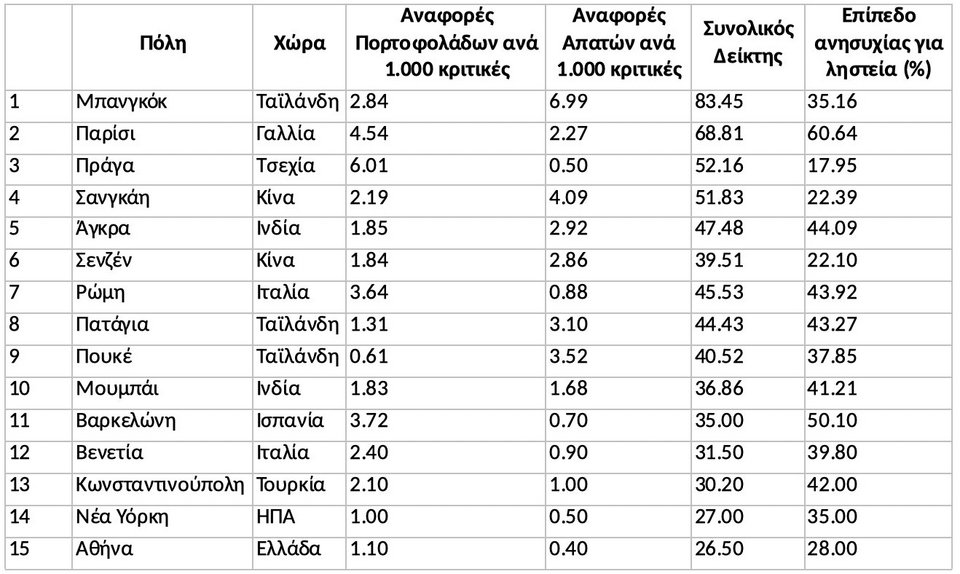 Η Αθήνα κατατάσσεται στην 15η θέση παγκοσμίως (και 19η σε ευρύτερη κατάταξη). Η Ακρόπολη και η Πλάκα εμφανίζουν σχεδόν 8 φορές λιγότερες αναφορές για κλοπές σε σχέση με το Παρίσι, καθιστώντας την ελληνική πρωτεύουσα ως ένας από τους πιο ασφαλείς προορισμούς της Ευρώπης για το 2025.