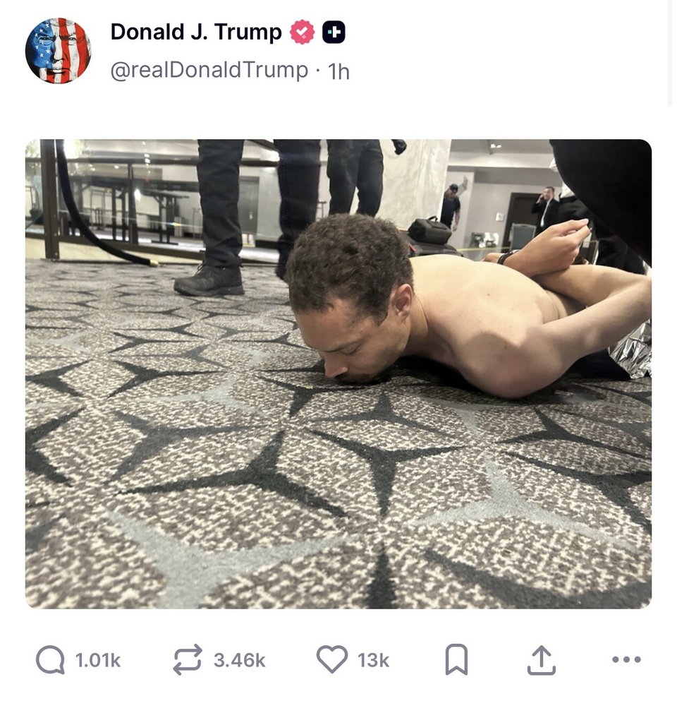 «Τι βραδιά κι αυτή» στην Ουάσιγκτον, ανέφερε ο μεγιστάνας μέσω Truth Social. Η υπηρεσία προστασίας του προέδρου και υψηλών προσώπων (Secret Service) «έκανε φανταστική δουλειά. Ενήργησε με ταχύτητα και θάρρος. Ο δράστης προσήχθη και πρότεινα το "σόου να συνεχιστεί", αλλά ακούω τις συστάσεις των υπηρεσιών επιβολής του νόμου».