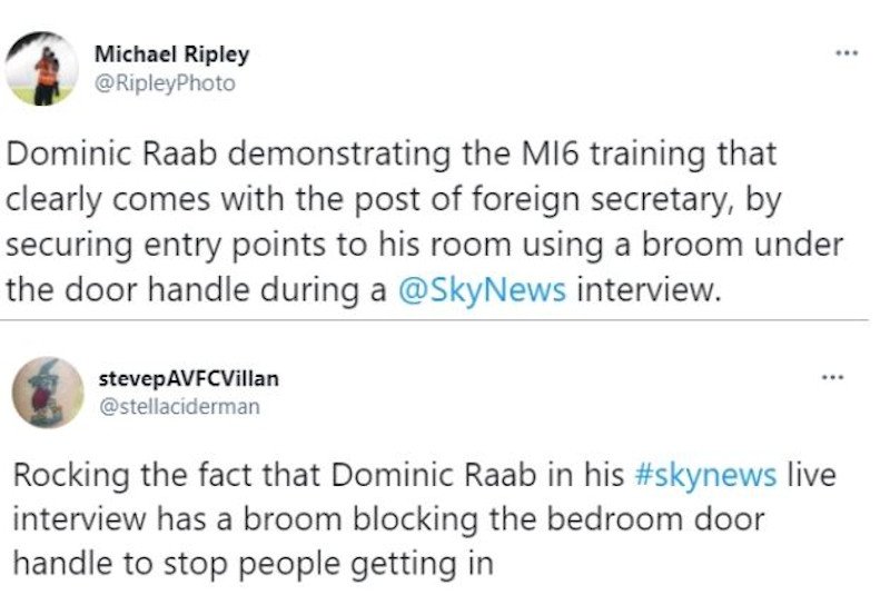 Το σούσουρο για το λόγο που ο υπουργός μοστράρισε τη σκούπα του συνεχίστηκε με έναν άλλο χρήστη να σημειώνει ότι «ο Ντόμινικ Ράαμπ έκανε επίδειξη της εκπαίδευσης των πρακτόρων της MI6 που αντιστοιχεί στο πόστο του υπουργού εξωτερικών διασφαλίζοντας τα σημεία εισόδου στο δωμάτιό του με μια σκούπα να μπλοκάρει το πόμολο».