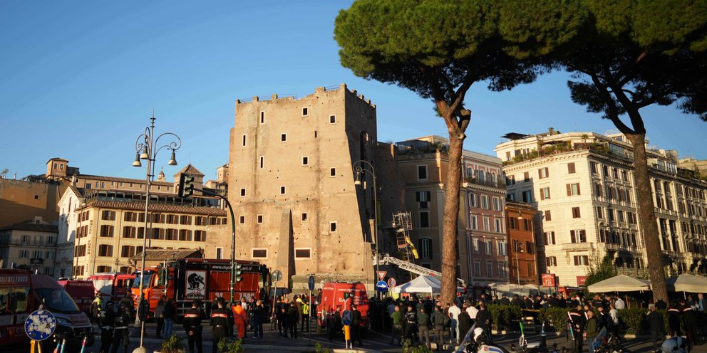Οι πυροσβέστες συνεχίζουν στο κέντρο της Ρώμης τις προσπάθειες απεγκλωβισμού του εργάτη που βρίσκεται ακόμη κάτω από τα συντρίμμια, εξαιτίας της κατάρρευσης τμήματος του Πύργου των Κόμηδων, κοντά στο Κολοσσαίο.