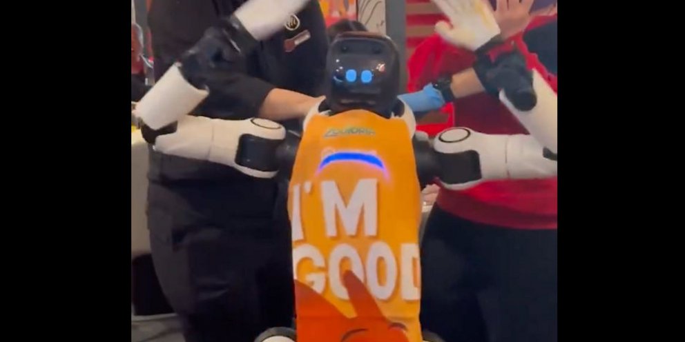Φορώντας την κίτρινη ποδιά του, που έγραφε «είμαι καλά», το ρομπότ έπρεπε να περνά ανάμεσα στα τραπέζια των πελατών του κινεζικού εστιατορίου στην Καλιφόρνια.