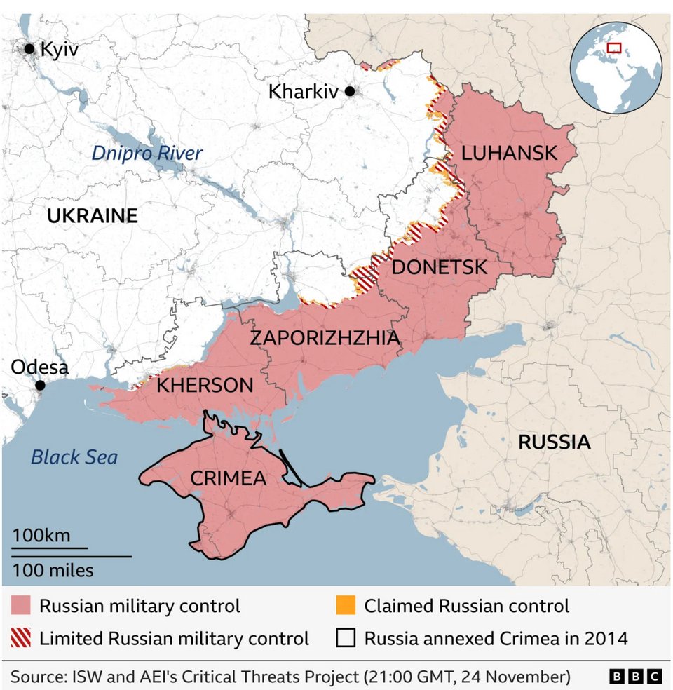 Σύμφωνα με το BBC, αν και αμφότερες ΗΠΑ και Ουκρανία έχουν προχωρήσει σε διαβουλεύσεις για μια ειρηνευτική συμφωνία, η πρόταση που έχει προκύψει φαίνεται να είναι περισσότερο ευνοϊκή για τις ρωσικές απαιτήσεις, παρά τις τροποποιήσεις του κειμένου, ενώ οι διαφωνίες παραμένουν έντονες, ειδικά στο ζήτημα της αναγνώρισης των κατεχόμενων περιοχών από τη Μόσχα. Ο Πούτιν ανέφερε ότι η νέα πρόταση, η οποία δείχνει να έχει υποστεί αναθεώρηση από διπλωμάτες της Ουάσιγκτον και του Κιέβου, ενδέχεται να αποτελέσει τη βάση για μια μελλοντική συμφωνία.