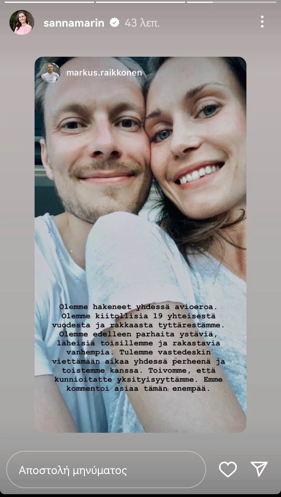 Η Σάνα Μαρίν, που επισημοποίησε με γάμο σε στενό κύκλο πριν από τρία καλοκαίρια, μεσούσης της πανδημίας του κορωνοϊού, τον δεσμό της με τον Ραϊκόνεν, έχει αποκτήσει μαζί του μια κόρη, ηλικίας πέντε ετών σήμερα, την Έμα Αμάλια Μαρίν. Αλλά χθες το ζευγάρι ανακοίνωσε μέσω Instagram το τέλος της κοινής τους πορείας.