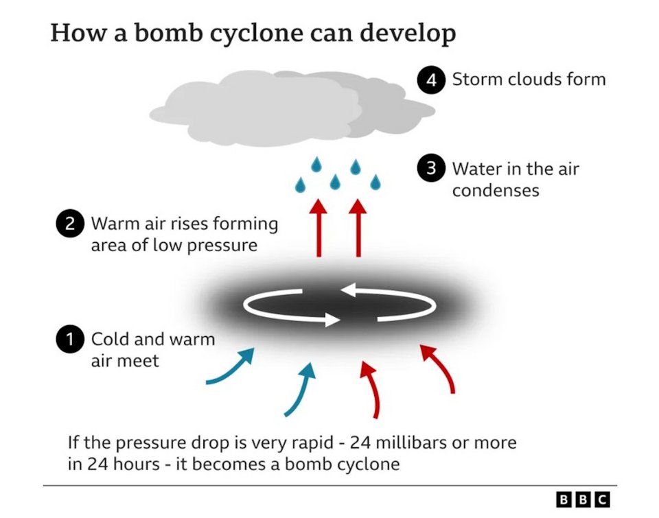 «Ο κυκλώνας βόμβα», μια ιστορικών διαστάσεων χειμερινή καταιγίδα, σύμφωνα με την αμερικανική μετεωρολογική υπηρεσία (NWS), προκάλεσε σημαντικές χιονοπτώσεις, ισχυρές ριπές παγωμένων ανέμων και θερμοκρασίες που κατά τόπους έφτασαν τους -48 βαθμούς Κελσίου, ικανές να μεταμορφώνουν σε μια στιγμή το βραστό νερό σε σταγονίδια πάγου.