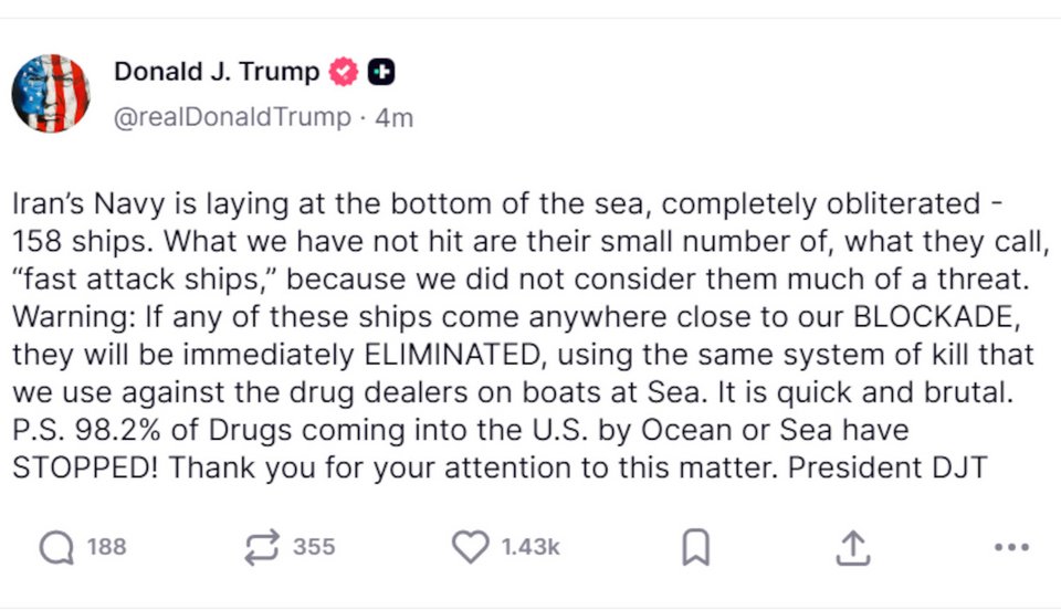 Σε ανάρτησή του ο Τραμπ αναφέρει: «Το Πολεμικό Ναυτικό του Ιράν βρίσκεται στον βυθό της θάλασσας, εντελώς κατεστραμμένο –158 πλοία. Αυτά που δεν χτυπήσαμε είναι ο μικρός αριθμός των, όπως τα αποκαλούν, «σκαφών ταχείας επίθεσης», επειδή δεν τα θεωρήσαμε ιδιαίτερη απειλή. Προειδοποίηση: Εάν οποιοδήποτε από αυτά τα πλοία πλησιάσει έστω και λίγο το μπλόκο μας, θα ΕΞΟΛΟΘΡΕΥΤΕΙ αμέσως, χρησιμοποιώντας το ίδιο σύστημα εξόντωσης που χρησιμοποιούμε εναντίον των εμπόρων ναρκωτικών σε σκάφη στη θάλασσα. Είναι γρήγορο και βίαιο. Υ.Γ. Το 98,2% των ναρκωτικών που εισέρχονται στις ΗΠΑ μέσω ωκεανού ή θάλασσας έχει ΣΤΑΜΑΤΗΣΕΙ! Σας ευχαριστώ για την προσοχή σας σε αυτό το θέμα. Πρόεδρος DJT»