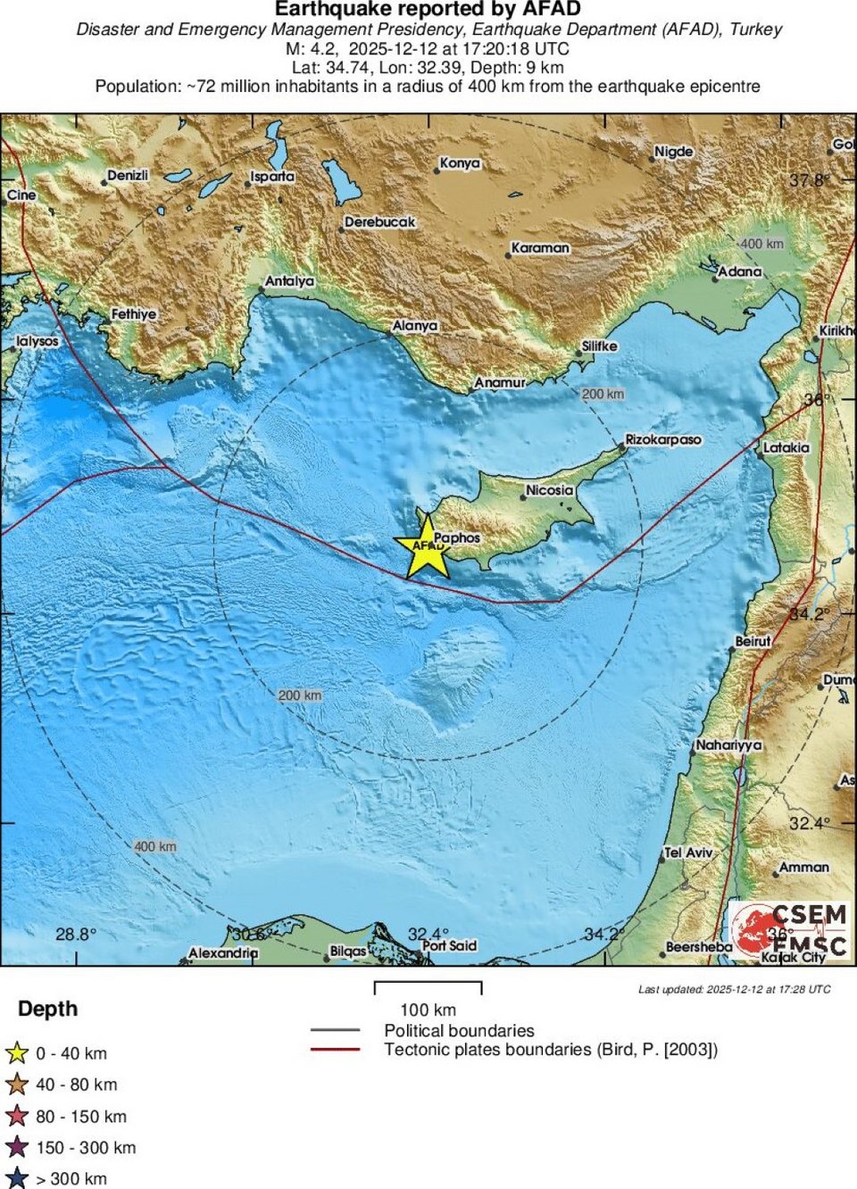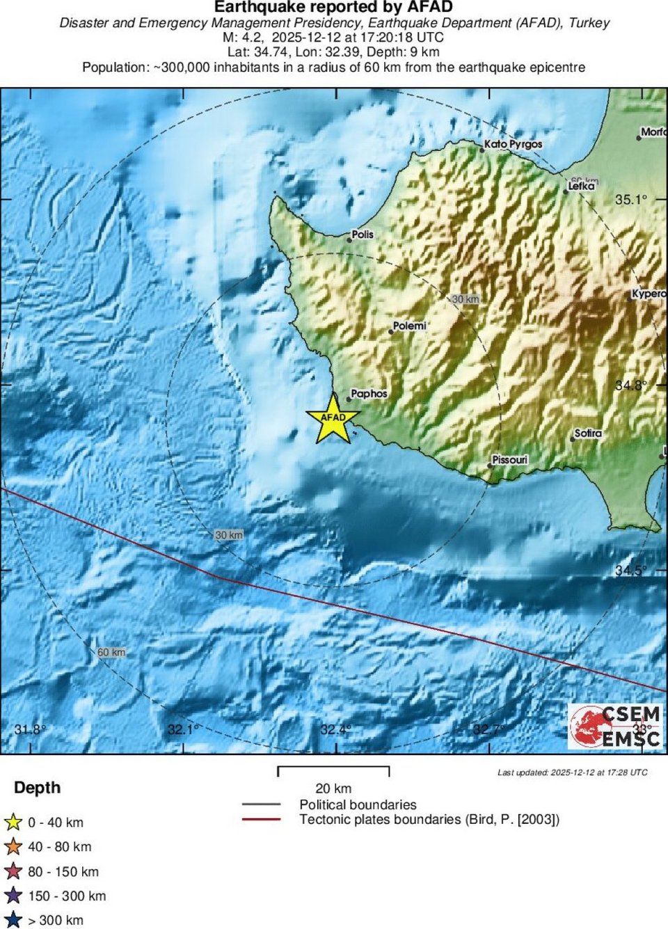 Σύμφωνα με το Ευρωμεσογειακό Σεισμολογικό Κέντρο, η δόνηση καταγράφηκε γύρω στις 19:20, νοτιοδυτικά της Πάφου, με το εστιακό βάθος να υπολογίζεται στα οκτώ χιλιόμετρα.