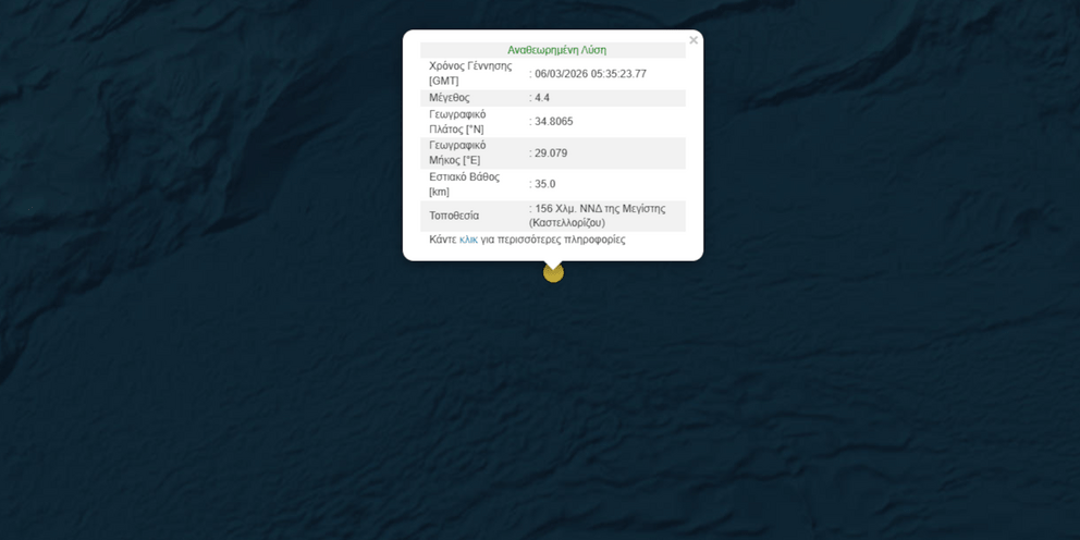 Σύμφωνα με το Γεωδυναμικό Ινστιτούτο του Εθνικού Αστεροσκοπείου Αθηνών, το επίκεντρο της δόνησης εντοπίζεται στον θαλάσσιο χώρο 156 χλμ. νότια-νοτιοδυτικά της Μεγίστης (Καστελορίζου).