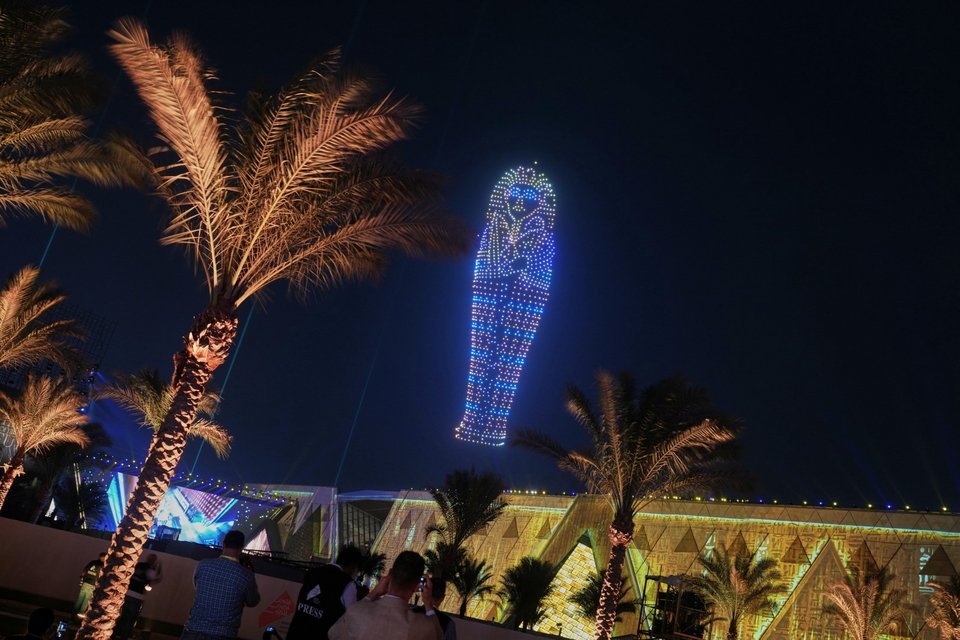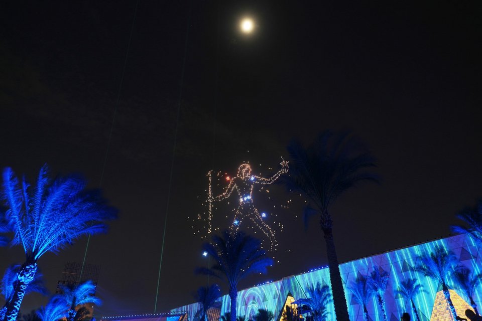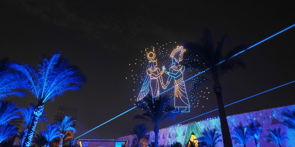Αν κάτι όμως θα θυμούνται οι εκατοντάδες καλεσμένοι στην μαγευτική τελετή, αυτό σίγουρα θα είναι οι εικόνες με τα εκατοντάδες drones που σε έναν μαγευτικό συγχρονισμό αποτύπωσαν χαρακτηριστικά αντικείμενα και εικόνες του μοναδικού και πανάρχαιου αιγυπτιακού πολιτισμού. Συνοδεία εντυπωσιακών πυροτεχνημάτων, ο ουρανός πάνω από τις εμβληματικές πυραμίδες της Γκίζας γέμισε με χρώματα και σχέδια.