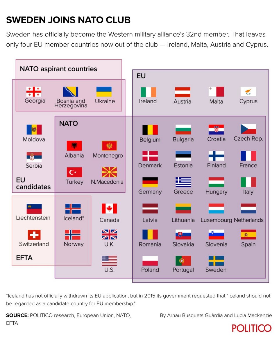 «Είναι επίσημο - Η Σουηδία είναι πλέον το 32ο μέλος του ΝΑΤΟ, παίρνοντας τη θέση που δικαιούται στο τραπέζι μας» ανέφερε στο Twitter ο Γενς Στόλτενμπεργκ.