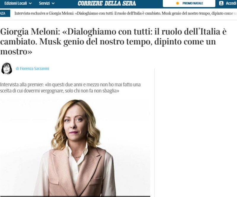 Η εκτίμηση φαίνεται ότι είναι αμοιβαία, με τη Μελόνι να δηλώνει σε συνέντευξή της στην ιταλική εφημερίδα Corriere della Sera ότι ο Μασκ είναι «ιδιοφυΐα», που περιγράφεται «ως τέρας μόνον επειδή επέλεξε τη "λάθος πλευρά" πολιτικά».