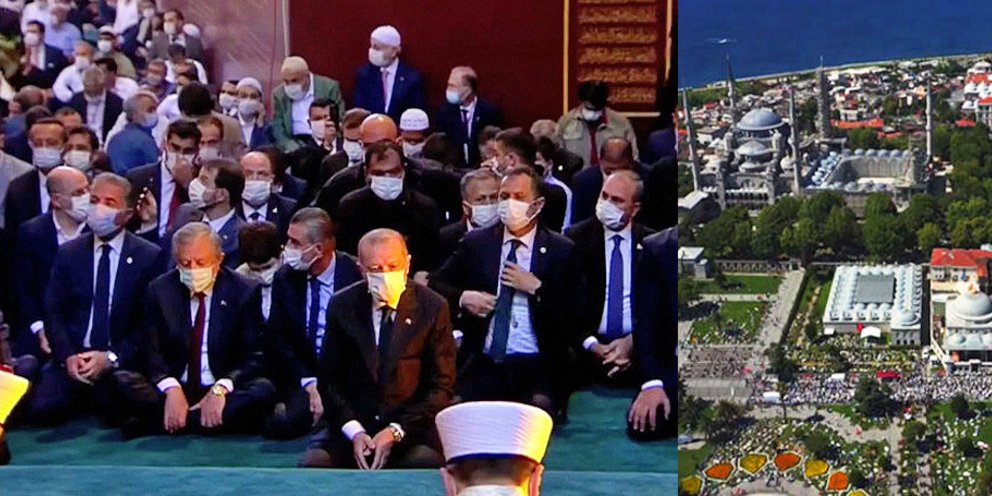 Ο Τούρκος πρόεδρος φορούσε μάσκα, όπως και όλοι όσοι τον συνόδευαν, και αφού γονάτισε στα ειδικά χαλιά που έχουν τοποθετηθεί, προσευχήθηκε και ο ίδιος. Φυσικά, την όλη διαδικασία μετέδιδαν σε ζωντανή σύνδεση το CNN Turk και άλλα κανάλια, με καλεσμένους που μιλούσαν για τη μετατροπή της Αγίας Σοφίας σε τζαμί.