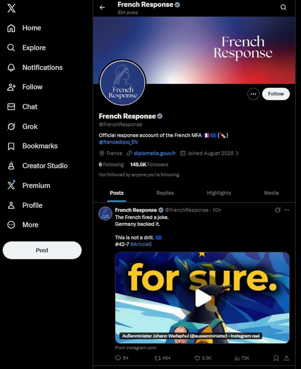 Ο λογαριασμός French Response δημιουργήθηκε τον Αύγουστο, λίγο πριν από τη Γενική Συνέλευση των Ηνωμένων Εθνών, και μέσα σε λίγους μήνες πλησίασε τους 150.000 ακολούθους. Σκοπός του είναι, αφενός, να αποδομεί σε πραγματικό χρόνο εχθρικές ή παραπλανητικές αφηγήσεις και, αφετέρου, να στέλνει το μήνυμα ότι η Γαλλία δεν θα αφήνει αναπάντητες επιθέσεις στον ψηφιακό χώρο.