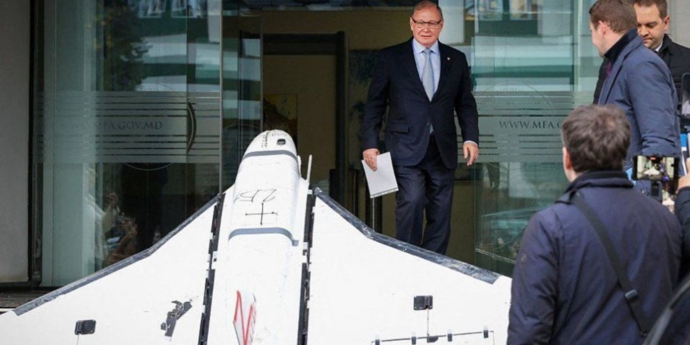 Κατά την άφιξή του στο υπουργείο, ο Ρώσος πρέσβης Ολέγκ Οζέροφ βρέθηκε αντιμέτωπος με ένα drone 18 κιλών, το οποίο είχε προσγειωθεί σε στέγη σπιτιού στη βόρεια Μολδαβία όταν ξέμεινε από καύσιμα.