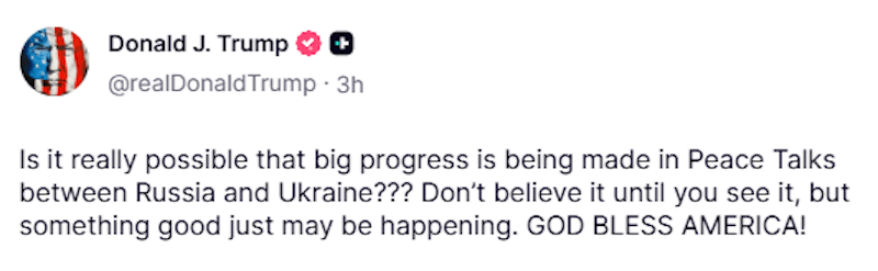 «Είναι πιθανό να έχει επιτευχθεί μεγάλη πρόοδος στις συνομιλίες για το σχέδιο ειρήνης μεταξύ της Ρωσίας και της Ουκρανία; Μην πιστεύετε τίποτα μέχρι να δείτε το αποτέλεσμα, αλλά κάτι καλό είναι πιθανό να συμβαίνει», έγραψε νωρίτερα, από την πλευρά του, ο Ντόναλντ Τραμπ.