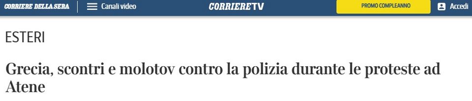 «Ελλάδα, συγκρούσεις και βόμβες μολότοφ κατά της αστυνομίας σε διαδηλώσεις στην Αθήνα», γράφει την χώρα μας η ιταλική Corriere della sera.