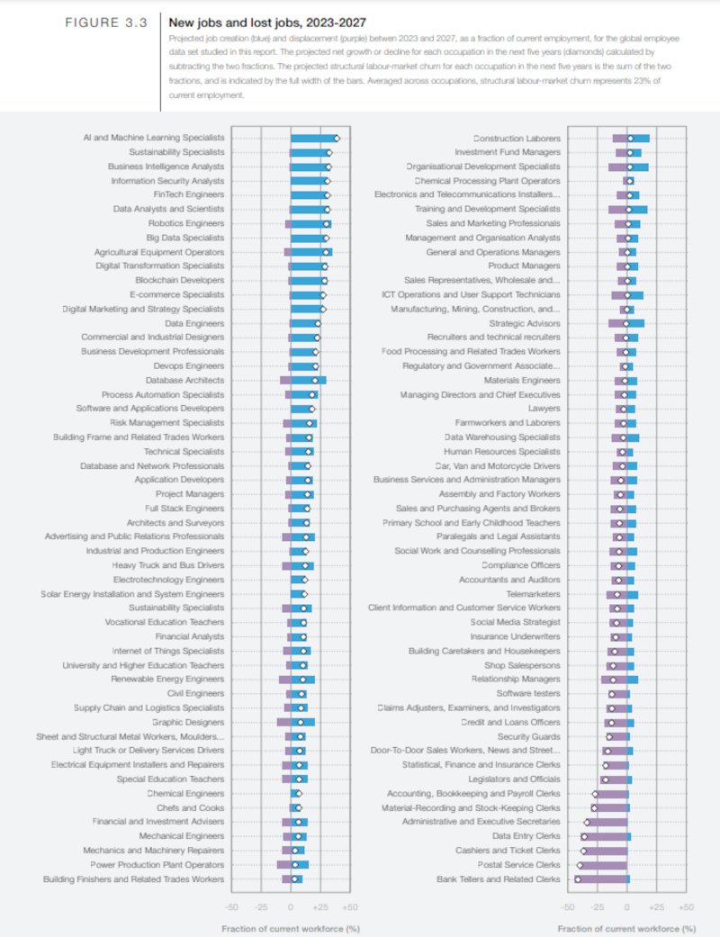Η έρευνα δείχνει ότι περίπου 69 εκατ. θέσεις εργασίας θα δημιουργηθούν και και θα καταργηθούν 83 εκατομμύρια θέσεις μέχρι το 2027. Αυτό θα οδηγήσει σε καθαρή απώλεια 14 εκατομμυρίων θέσεων εργασίας, που αντιστοιχεί στο 2% της σημερινής απασχόλησης, σύμφωνα με την έκθεση «Future of Jobs».
