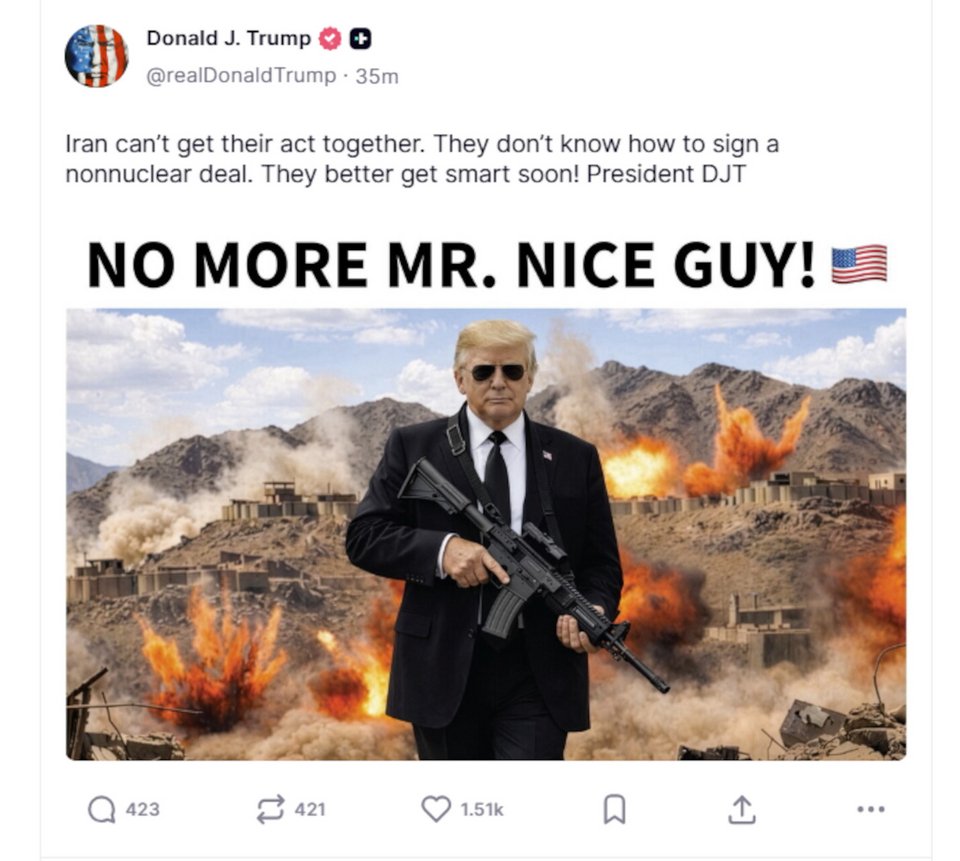 «Τέρμα το καλό παιδί», δήλωσε ο Ντόναλντ Τραμπ» με ΑΙ φωτογραφία, απευθυνόμενος στο Ιράν σε ανάρτησή του.
