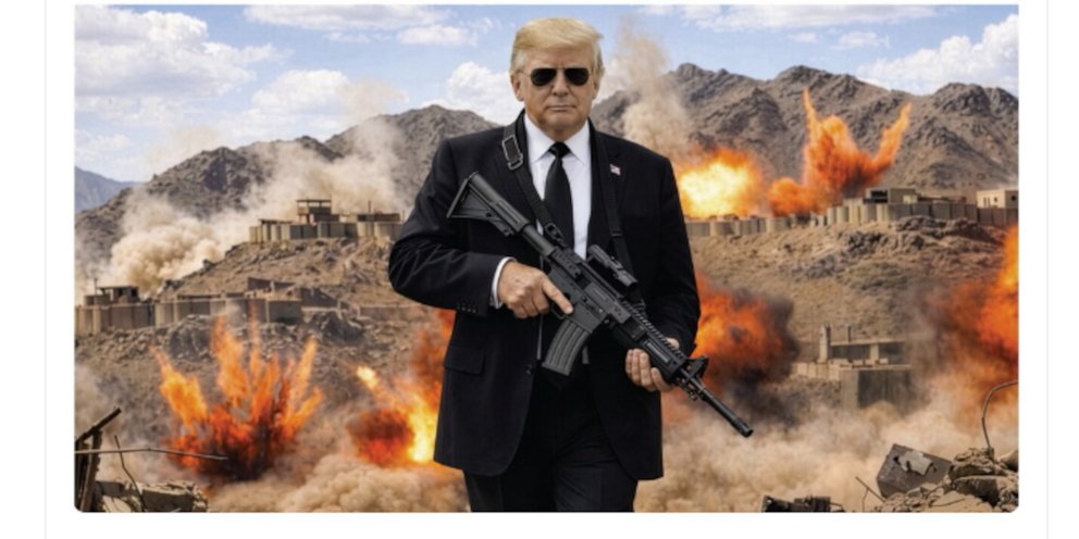 Η παραπάνω ανάρτηση συνοδεύεται από μια φωτογραφία, προϊόν Τεχνητής Νοημοσύνης όπου ο Τραμπ εμφανίζεται ένοπλος σε κάποιο πεδίο μάχης, φορώντας γυαλιά ηλίου, σαν από ταινία δράσης.