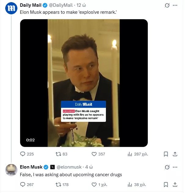 Απαντώντας κάτω από το δημοσίευμα της Daily Mail στο Χ, o Έλον Μασκ επέμεινε ότι το σχόλιο που το αποδόθηκε ήταν λανθασμένο. «Λάθος, ρωτούσα για τα επερχόμενα φάρμακα για τον καρκίνο» έγραψε , ισχυριζόμενος πως η συζήτησή του με τον Μπουρλά είχε σχέση με τις ιατρικές εξελίξεις και όχι με γεωπολιτική.