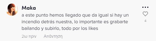 «Έχουμε φτάσει σε αυτό το σημείο που δεν έχει σημασία αν υπάρχει φωτιά πίσω μας, το σημαντικό είναι να καταγράψουμε τον εαυτό μας να χορεύει και να το ανεβάσουμε, όλα για τα likes», αναφέρει χρήστης.