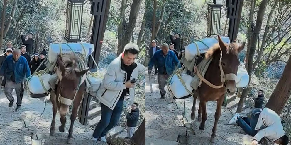 Άτυχος τουρίστας στην Κίνα βρέθηκε στο κενό όταν τον εκτόπισε ένα μουλάρι, καθώς αυτός χάζευε στο κινητό του.