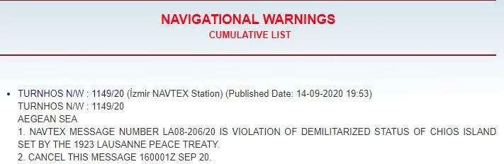 Μάλιστα, στην αντι-Navtex που εξέδωσε ο σταθμός της Νέας Σμύρνης, οι Τούρκοι αναφέρουν πως το νησί της Χίου πρέπει να αποστρατικοποιηθεί, γιατί «παραβιάζεται η Συνθήκη της Λωζάνης», όπως αναφέρει.