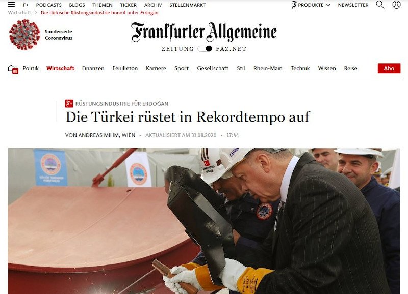 «Μόνο την περασμένη εβδομάδα, εν μέσω της κλιμάκωσης της σύγκρουσης για τα οικόπεδα φυσικού αερίου στην Κύπρο, ο Ρετζέπ Ταγίπ Ερντογάν ζήτησε η χώρα να σκαρφαλώσει στην “κορυφή του πρωταθλήματος” της βιομηχανίας όπλων. Δεν πρέπει "να χάσουμε ούτε λεπτό ", τόνισε. Οι περιφερειακές συγκρούσεις αναγκάζουν την Τουρκία να παράγει σύγχρονα οπλικά συστήματα με ίδιους πόρους. Μια εθνική αμυντική βιομηχανία “σε όλους τους κρίσιμους τομείς”, ανεξάρτητη από το εξωτερικό είναι ο πιο σημαντικός στόχος, είπε σε ένα ναυπηγείο», σύμφωνα με το δημοσίευμα.