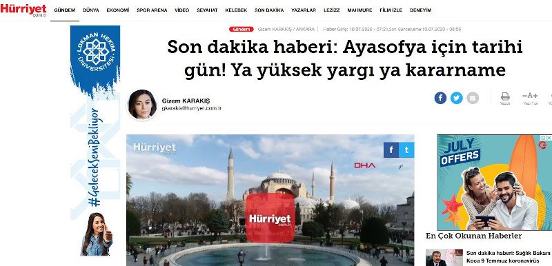 Η Hurriyet στο άρθρο της με τίτλο «Ιστορική μέρα για την Αγία Σοφία» υποστηρίζει ότι αν η απόφαση του τουρκικού ΣτΕ είναι θετική το θέμα θα πάει στη Γενική Διεύθυνση Βακουφίων, ενώ σε αντίθετη περίπτωση θα επιστρατευτεί προεδρικό διάταγμα για να λειτουργήσει ο εμβληματικός ναός ως τζαμί.