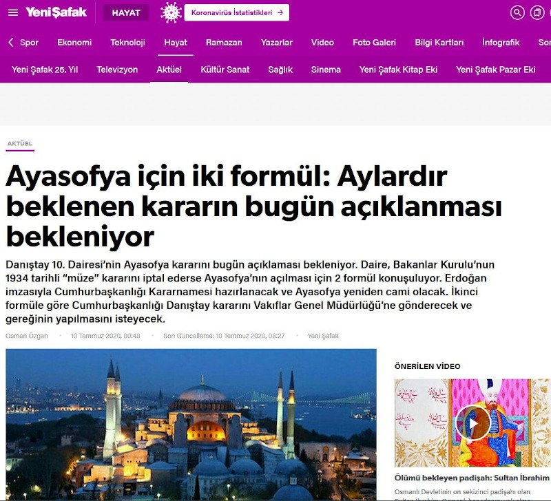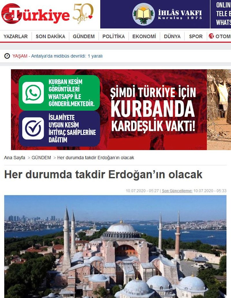 Στο ίδιο μήκος κύματος η εφημερίδα Turkiye σε ρεπορτάζ με τίτλο «Παρασκευή της Αγίας Σοφίας» αναφέρει ότι συζητείται πως το ΣτΕ έλαβε ομόφωνη απόφαση για ακύρωση του διατάγματος του 1934 κι ότι μετά από μια τέτοια γνωμοδότηση τα βλέμματα θα στραφούν προς τον Ερντογάν, που μπορεί με ένα διάταγμα εντός 30 ημερών να μετατρέψει την Αγία Σοφία σε τζαμί. Όπως σημειώνει, ακόμη και σε περίπτωση αρνητικής απόφασης του ΣτΕ η Αγία Σοφία μπορεί να ξανανοίξει για μουσουλμανική προσευχή, αφού βουλευτές νομικού του κόμματος του Ερντογάν εργάζονται για την έκδοση προεδρικού διατάγματος.