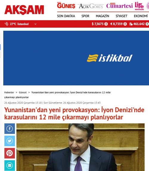 Ακσαμ: «Καινούρια πρόκληση από την Ελλάδα: Σχεδιάζουν να επεκτείνουν τα χωρικά ύδατα στο Ιόνιο στα 12 μίλια» αναφέρει η Ακσάμ.