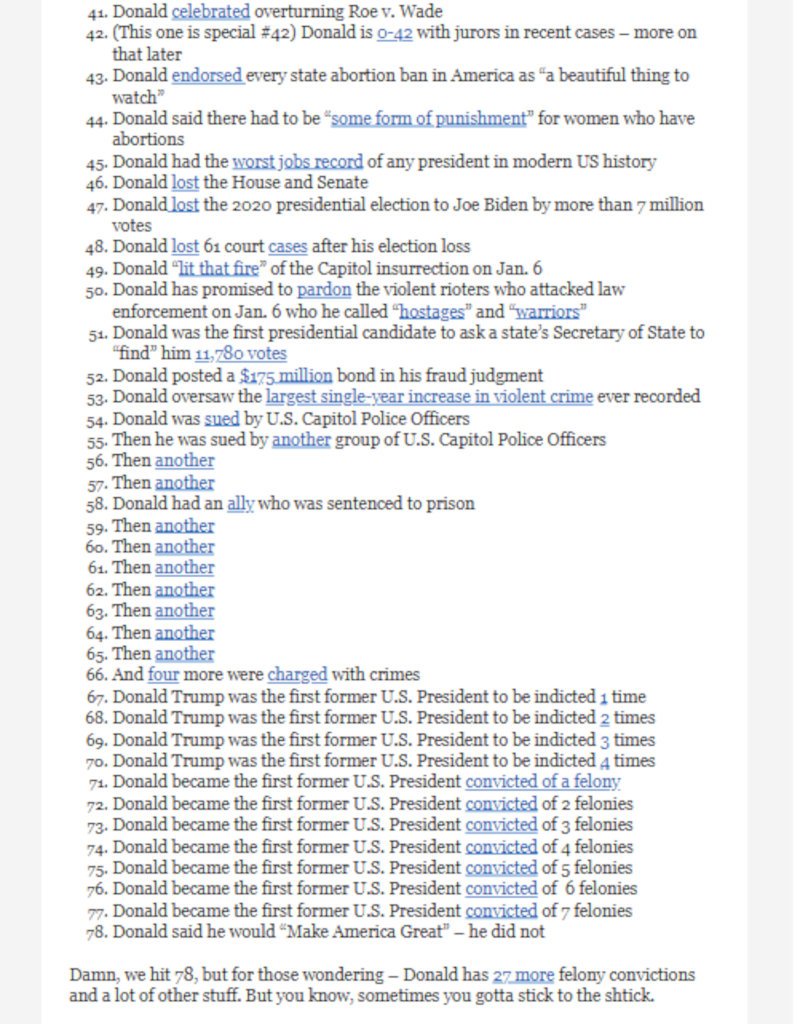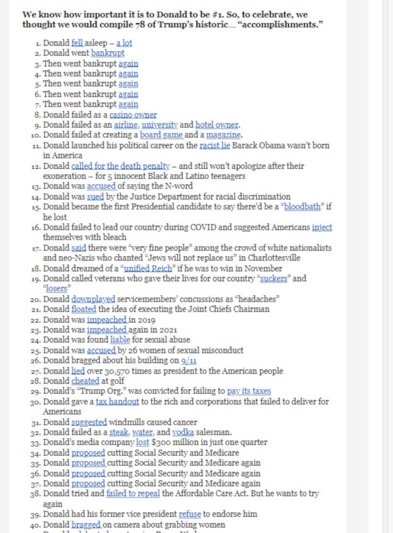 Στη σχετική ανάρτηση συνέταξε μάλιστα μια λίστα με «78… ιστορικά επιτεύγματα» του Τραμπ σημειώνοντας ότι ο 45ος πρόεδρος των ΗΠΑ ήταν ο πρώτος που καταδικάστηκε και παραπέμφθηκε για διάφορες κατηγορίες. Ο κατάλογος περιλαμβάνει τις δυσκολίες που αντιμετώπισε ο Τραμπ ως ιδιοκτήτης επιχειρήσεων, ένα βίντεο που είχε αναρτήσει στα μέσα κοινωνικής δικτύωσης, όπου αναφερόταν σε «ενοποιημένο Ράιχ», τον τρόπο που χειρίστηκε την πανδημία της Covid-19 κ.α.