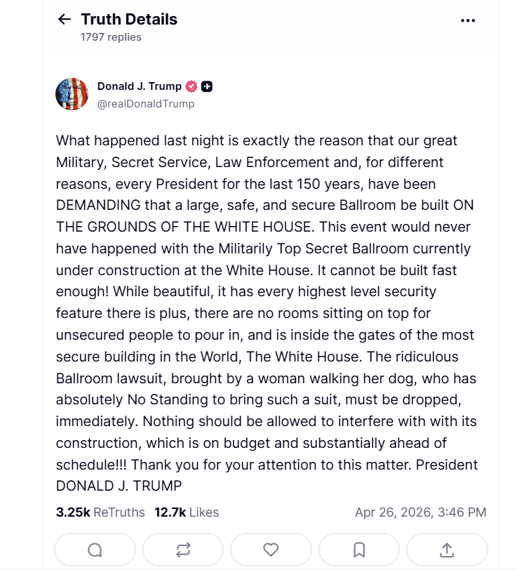 «Αυτό που συνέβη χθες το βράδυ είναι ακριβώς ο λόγος για τον οποίο ο σπουδαίος Στρατός μας, η Μυστική Υπηρεσία, οι Αρχές Επιβολής του Νόμου και, για διαφορετικούς λόγους, κάθε Πρόεδρος τα τελευταία 150 χρόνια, ΑΠΑΙΤΟΥΝ να κατασκευαστεί μια μεγάλη, ασφαλής και προστατευμένη αίθουσα δεξιώσεων ΕΝΤΟΣ ΤΩΝ ΟΡΙΩΝ ΤΟΥ ΛΕΥΚΟΥ ΟΙΚΟΥ», έγραψε ο Αμερικανός πρόεδρος.