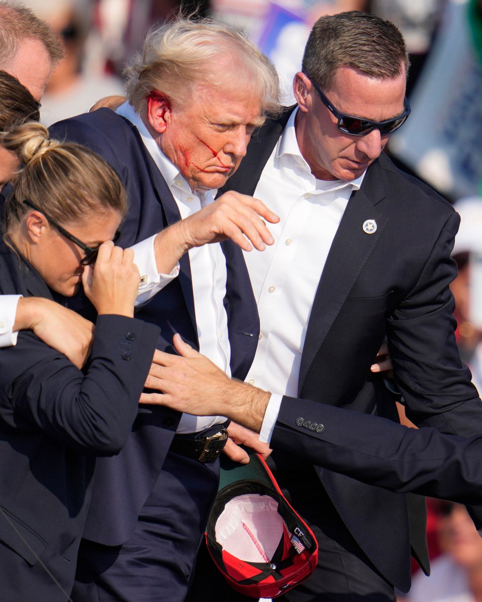 Το μικρόφωνο στην εξέδρα κατέγραψε το χάος. «Κουνηθείτε, κουνηθείτε» ακούγονται να λένε. Εκείνη τη στιγμή δεν ήταν σαφές σε ποια κατάσταση βρισκόταν ο Τραμπ, κρυμμένος όπως ήταν, πίσω από το βήμα. Και τότε σηκώθηκε, με το δεξί του αυτί να αιμορραγεί. Τον έβαλαν σε ένα θωρακισμένο αυτοκίνητο και τον απομάκρυναν.