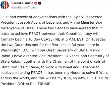 «Μόλις είχα εξαιρετικές συνομιλίες με τον εξαιρετικά σεβαστό Πρόεδρο του Λιβάνου, Τζόζεφ Αούν, και τον Πρωθυπουργό του Ισραήλ, Μπίμπι Νετανιάχου. Οι δύο ηγέτες συμφώνησαν ότι, προκειμένου να επιτευχθεί ΕΙΡΗΝΗ μεταξύ των χωρών τους, θα ξεκινήσουν επίσημα μια 10ήμερη ΕΚΕΧΕΙΡΙΑ στις 5 μ.μ. (ώρα Ανατολικής Ακτής)» έγραψε στο Truth Social ο Αμερικανός πρόεδρος (μεσάνυχτα ώρα Ελλάδας).