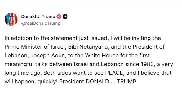 «Θα προσκαλέσω τον Πρωθυπουργό του Ισραήλ, Μπίμπι Νετανιάχου, και τον Πρόεδρο του Λιβάνου, Τζόζεφ Αούν, στον Λευκό Οίκο για τις πρώτες ουσιαστικές συνομιλίες μεταξύ Ισραήλ και Λιβάνου από το 1983 - πριν από πολύ καιρό. Και οι δύο πλευρές θέλουν να δουν ΕΙΡΗΝΗ και πιστεύω ότι αυτό θα συμβεί, γρήγορα!» πρόσθεσε σε δεύτερη ανάρτησή του.