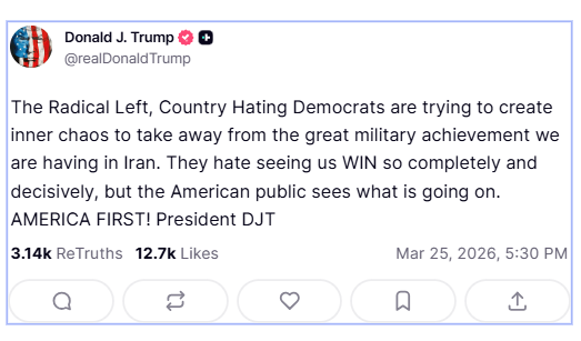 «Η ριζοσπαστική Αριστερά, οι Δημοκρατικοί που μισούν τη χώρα, προσπαθούν να δημιουργήσουν εσωτερικό χάος για να αποσπάσουν την προσοχή από τη μεγάλη στρατιωτική επιτυχία που έχουμε στο Ιράν. Μισούν να μας βλέπουν να κερδίζουμε τόσο ολοκληρωτικά και αποφασιστικά, αλλά ο αμερικανικός λαός βλέπει τι συμβαίνει».