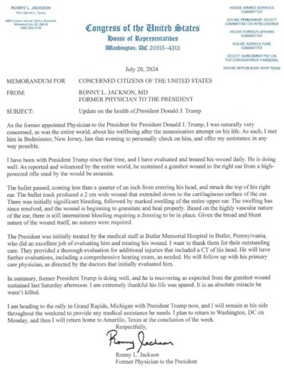 «Όπως αναφέρθηκε και είδε όλος ο κόσμος, υπέστη τραύμα από σφαίρα στο δεξί αυτί από τουφέκι μεγάλης ισχύος που χρησιμοποίησε ο επίδοξος δολοφόνος», έγραψε ο Τζάκσον, σημειώνοντας ότι εξέτασε τον Τραμπ τη νύχτα που πυροβολήθηκε.
